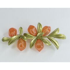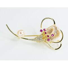 Брошь из гипоаллергенного ювелирного сплава желтого цвета. Вставка- кварц белого, красного цвета и жемчуг, перламутр, цвет- белый. Высота броши-5,0см, ширина-3,0см. Застежка- булавка.