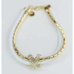 Браслет женский из кожаного шнура белого цвета и высококачественного гипоаллергенного ювелирного сплава желтого цвета. Вставка- цирконы белого цвета. Размер-18,0 с удлиняющей цепочкой. Замок- карабин.