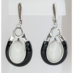 Серьги женские из гипоаллергенного ювелирного сплава серого цвета с покрытием эмалью черного цвета. Вставка- улексит (кошачий глаз) серого цвета. Высота серег- 5,0см, ширина- 2,0см. Английский замок (штифт-1,0см).