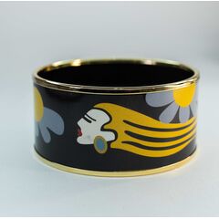 Браслет из гипоаллергенного ювелирного сплава желтого цвета. Покрытие эмалью черного цвета. Рисунок - эмаль, цвет - желтый, серый. Без вставок. Неразъемный. Высота браслета-3,4см, диаметр-7см.