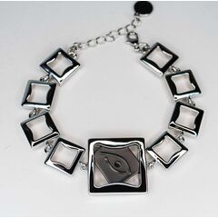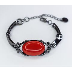 Браслет женский из гипоаллергенного ювелирного сплава черного цвета. В центре вставка- пластик красного цвета. Браслет состоит из звеньев по 2,0см. Высота центральной части браслета-2,0см, ширина-4,5см. Размер-17,0, застежка-карабин.