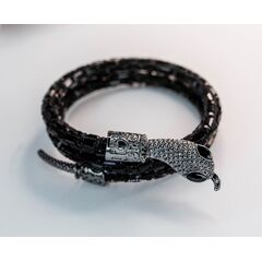 Браслет- змейка из гипоаллергенного ювелирного сплава серого цвета. Вставка- ювелирное стекло , цвет- черный. Браслет--незамкнутый и гнущийся, имеет спиралевидную форму.