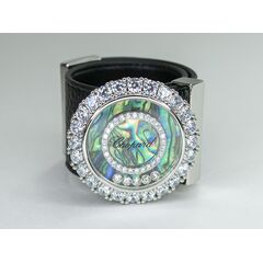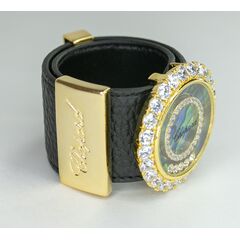 Браслет женский из гипоаллергенного ювелирного сплава желтого цвета и натуральной кожи черного цвета. Вставка- циркон белого цвета и перламутр радужного цвета. Высота браслета-4,0см, ширина-4,0см. Застежка-пряжка.