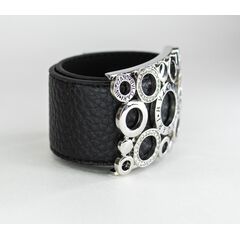 Браслет женский из гипоаллергенного ювелирного сплава серого цвета и натуральной кожи черного цвета. Вставка- циркон белого цвета. Покрытие эмалью черного цвета. Высота браслета-4,0см, ширина-4,0см. Застежка-пряжка.