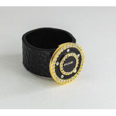 Браслет женский из гипоаллергенного ювелирного сплава желтого цвета и натуральной кожи черного цвета. Вставка- циркон белого цвета. Покрытие эмалью черного цвета. Высота браслета-4,0см, ширина-4,0см. Застежка-пряжка.