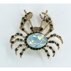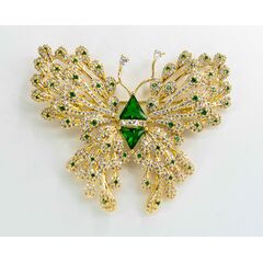 Брошь из гипоаллергенного ювелирного сплава желтого цвета. Вставка-ювелирное стекло белого и зеленого цвета. Высота броши- 5,0см, ширина-5,5см. Застежка- булавка.