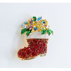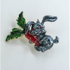 Брошь из гипоаллергенного ювелирного сплава желтого цвета. Покрытие эмалью зеленого, красного и серного цвета. Вставка- ювелирное стекло красного цвета. Высота броши-4см, ширина-4,5см. Застежка- булавка.