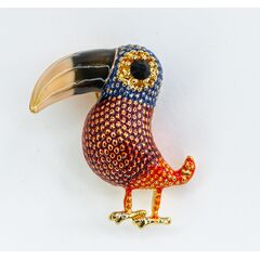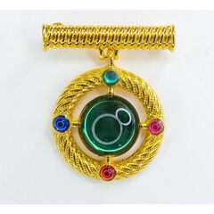 Брошь из гипоаллергенного ювелирного сплава желтого цвета. Вставка- ювелирное стекло красного, синего, зеленого цвета. Высота броши-4см, ширина-3,5см. Застежка- булавка.