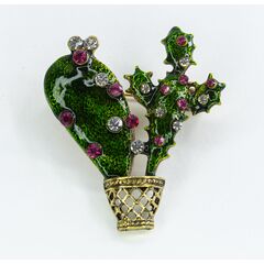 Брошь из гипоаллергенного ювелирного сплава желтого цвета. Покрытие эмалью зеленого цвета. Вставка- ювелирное стекло розового и белого цвета. Высота броши-4см, ширина-3,5см. Застежка- булавка.