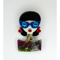 Брошь женская из гипоаллергенного ювелирного пластика, цвет- черный, красный, желтый, голубой. Высота брошки-6см, ширина-4см. Застежка- булавка.