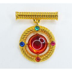 Брошь ( подвеска) из гипоаллергенного ювелирного сплава желтого цвета. Покрытие эмалью Красного, синего, зеленого цвета. Без вставок. Высота броши-4,5см, ширина-4,5см. Застежка-булавка.