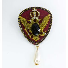 Брошь из гипоаллергенного ювелирного сплава, цвет- серый, желтый и текстиля красного цвета. Вставка- ювелирное стекло, цвет-черный и белый и иск. жемчуг белого цвета.Высота брошки-8см, ширина-5см. Застежка- булавка.