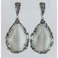 Серьги из гипоаллергенного ювелирного сплава серого цвета. Вставка- улексит ( кошачий глаз) серого цвета. Высота серег -5,0см, ширина -2,5см. Итальянский замок( штифт-1,2см и клипса).