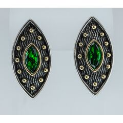Серьги женские из гипоаллергенного ювелирного сплава желтого и серого цвета. Вставка- кварц, цвет- зеленый. Высота серег- 3,0см, ширина- 1,5см. Итальянский замок (штифт-1,2см и клипса).