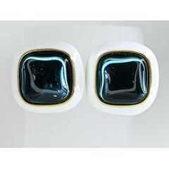 Серьги из гипоаллергенного ювелирного сплава желтого цвета. Вставка- улексит (кошачий глаз), цвет- лондон блю. Покрытие эмалью, цвет-белый. Высота серег-2,0см, ширина-2,0см. Итальянский замок (швенза-1,2см и застежка- клипса).