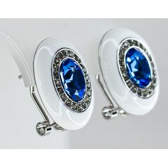 Серьги из гипоаллергенного ювелирного сплава желтого цвета. Вставка- улексит ( кошачий глаз) , цвет- синий. Покрытие эмалью белого цвета. Высота серег--3,5см, ширина-2,0см. Итальянский замок (швенза-1,2см и застежка- клипса).