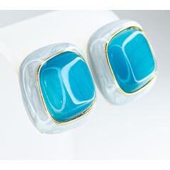 Серьги из гипоаллергенного ювелирного сплава желтого цвета. Вставка- улексит (кошачий глаз) голубого цвета. Покрытие эмалью, цвет-голубой. Высота серег-2,0см, ширина-2,0см. Итальянский замок (швенза-1,2см и застежка- клипса).