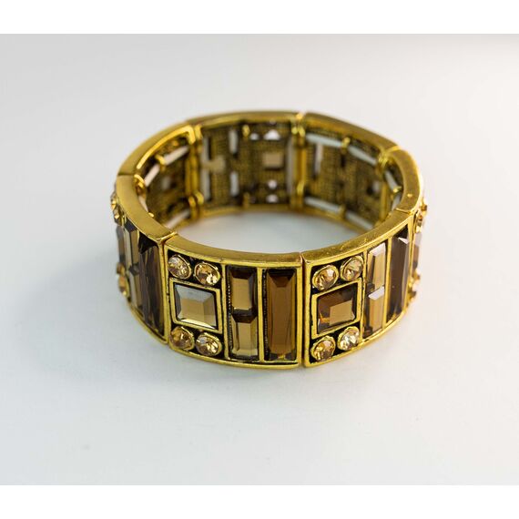 Браслет из гипоаллергенного ювелирного сплава желтого цвета. Вставка - ювелирное стекло, цвет- коньячный. Неразъемный, на резинке, безразмерный. Высота браслета-2,5см, диаметр-6см.