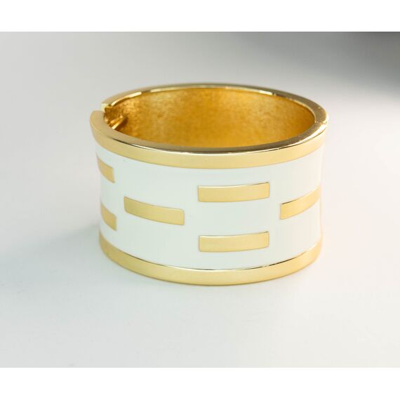 Браслет женский из гипоаллергенного ювелирного сплава, цвет-желтый. Покрытие-эмаль, цвет-белый. Браслет разъемный. высота-4см, ширина-7см.