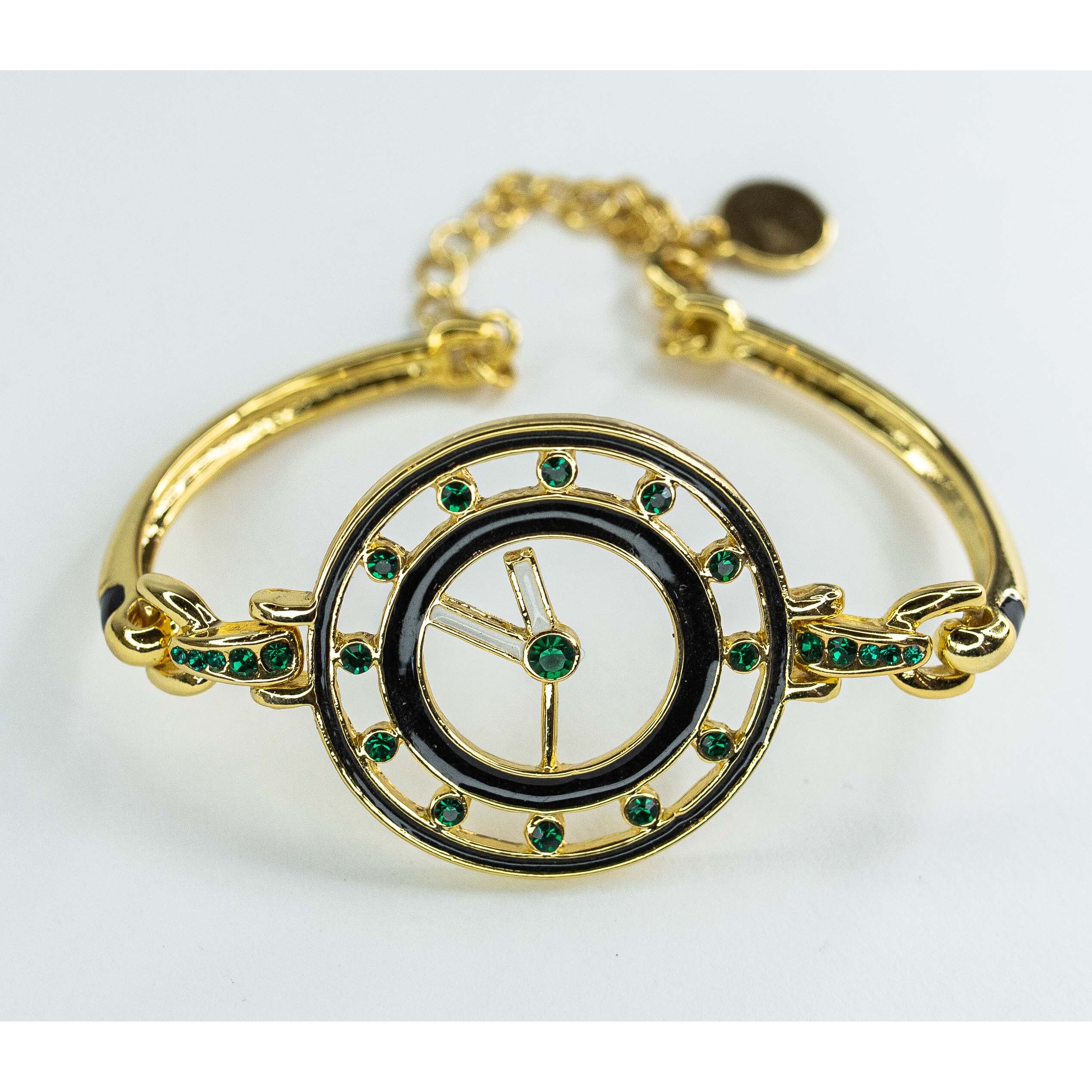 Браслет женский из гипоаллергенного ювелирного сплава, цвет - желтый. Вставка - ювелирное стекло,цвет - зелёный. Покрытие эмалью белого и черного цвета. Диаметр центра браслета - 3,5см. Размер - 18,0 + 0,7см.