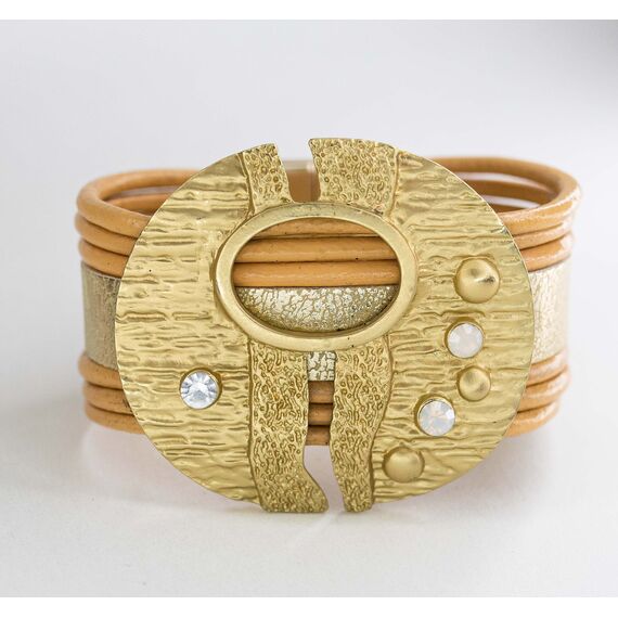 Браслет из гипоаллергенного ювелирного сплава желтого цвета и ремешка из кожи желтого цвета. Вставка- ювелирное стекло белого цвета. Высота браслета с пряжкой--5,0см, высота кожаного ремешка-4,0см. Застежка- пряжка, размер-18,0.