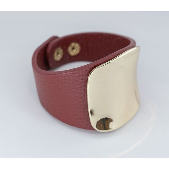 Браслет из гипоаллергенного ювелирного сплава желтого цвета и ремешка из кожи бордового цвета. Высота браслета-6,0см. Застежка- кнопка, размер-18,0.