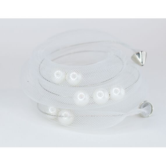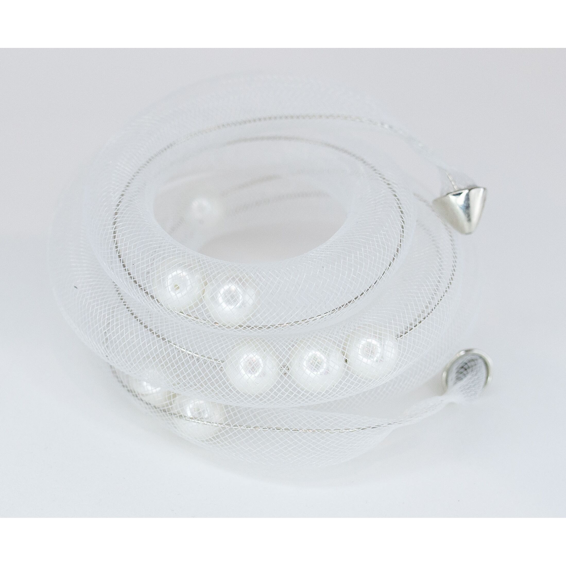 Браслет женский выполнен из ювелирной сетки белого цвета и гипоаллергенного ювелирного сплава серого цвета. Вставка- жемчуг Майорка, цвет- белый. Браслет незамкнутый, безразмерный, без замка.