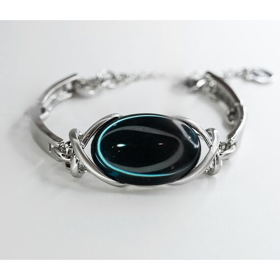 Браслет женский из гипоаллергенного ювелирного сплава серого цвета. Вставка- улексит( кошачий глаз) , цвет- лондон блю. Высота центра браслета-2см, ширина-4см. Замок у браслета- карабин, размер-18,0+0,5см.