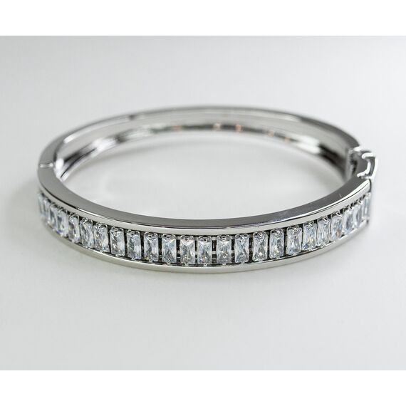 Браслет-обод жесткий из гипоаллергенного ювелирного сплава серого цвета. Разъемный. Высота-0,6см, вставка -ювелирное стекло белого цвета.