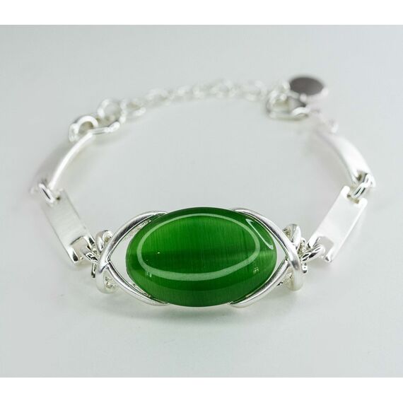 Браслет женский из гипоаллергенного ювелирного сплава серого цвета. Вставка- улексит( кошачий глаз) , цвет- зелёный. Высота центра браслета-2см, ширина-4см. Размер-18,0+0,5см, замок-карабин.