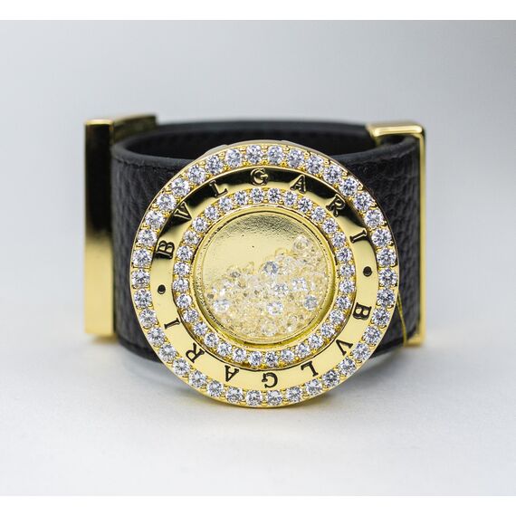 Браслет женский из гипоаллергенного ювелирного сплава желтого цвета и кожи черного цвета. Высота и ширина литой металлической части браслета-3,5см. Вставка- рассыпные цирконы белого цвета. Высота ремешка из кожи-2,6см.Застежка-пряжка.
