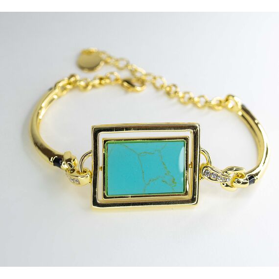 Браслет из гипоаллергенного ювелирного сплава желтого цвета. Вставка- перламутр, ювелирное стекло белого цвета и бирюза. Высота центра браслета-2,5см, ширина-3,5см. Жесткая часть браслета с двух сторон по 4см. Замок-карабин, размер браслета-18,0+0,5см.