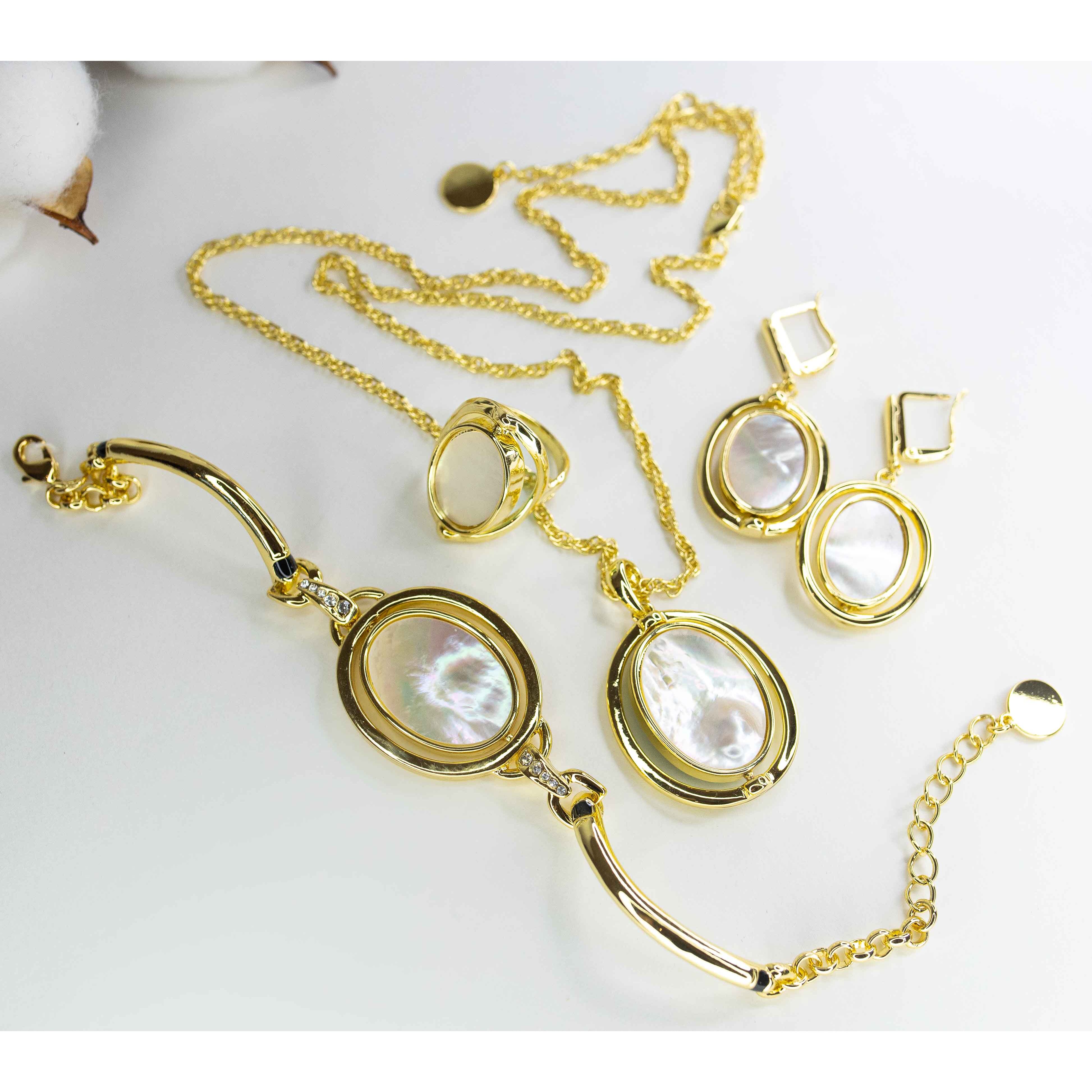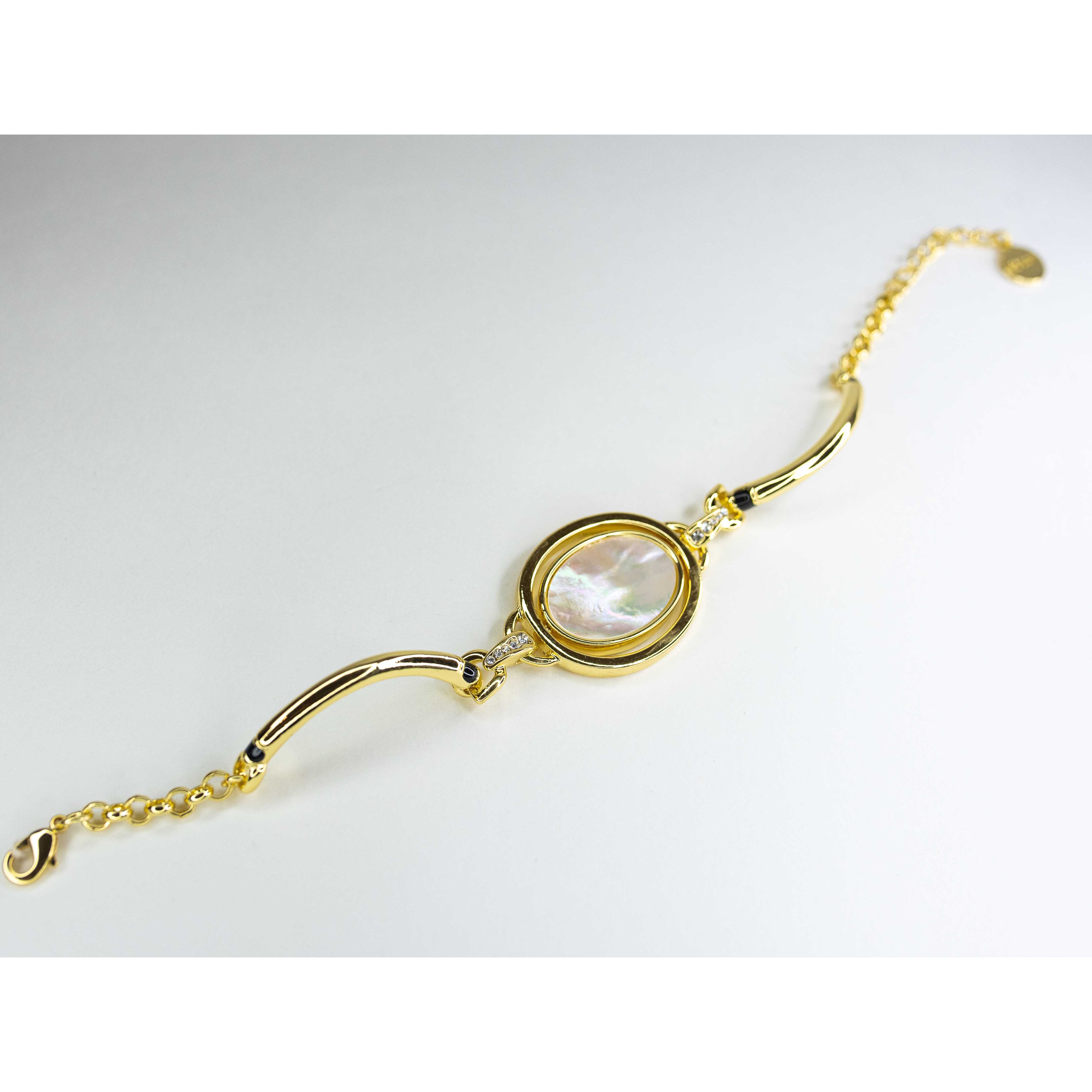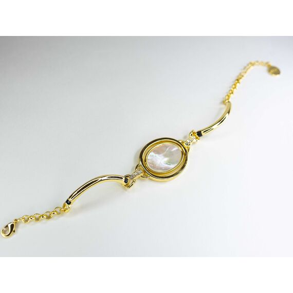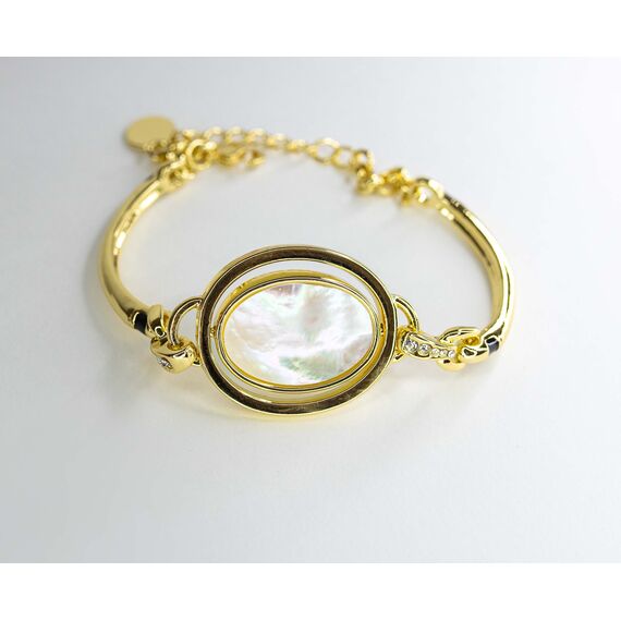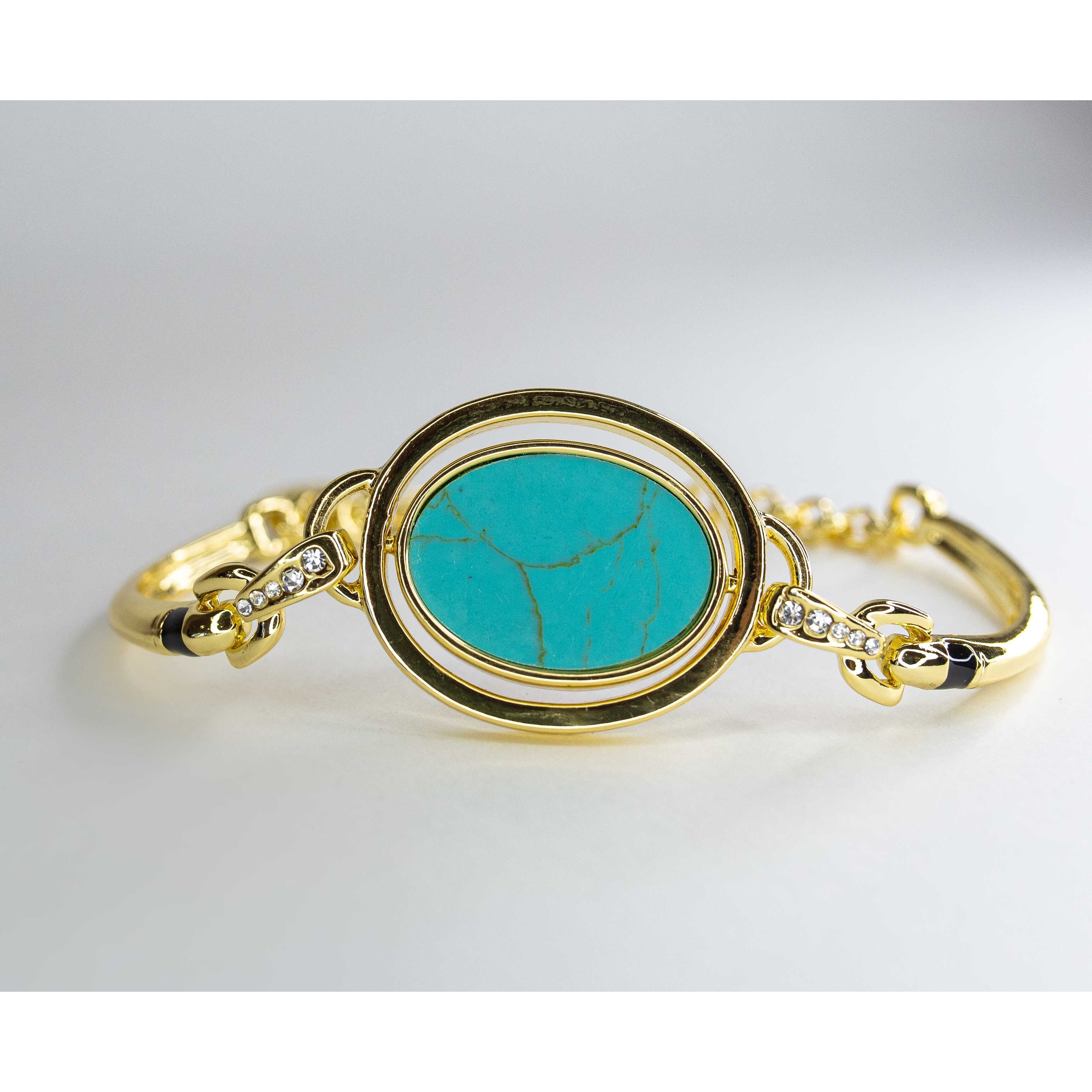 Браслет из гипоаллергенного ювелирного сплава желтого цвета. Вставка- перламутр, ювелирное стекло белого цвета и бирюза. Высота центра браслета-3см, ширина-3,5см. Жесткая часть браслета с двух сторон по 4см. Замок-карабин, размер браслета-18,0+0,5см.