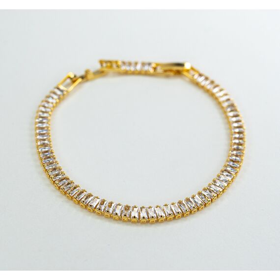 Браслет женский из гипоаллергенного ювелирного сплава желтого цвета. Вставка- цирконы белого цвета. Высота браслета-0,5см. Застежка- коробка. Размер-18,0.