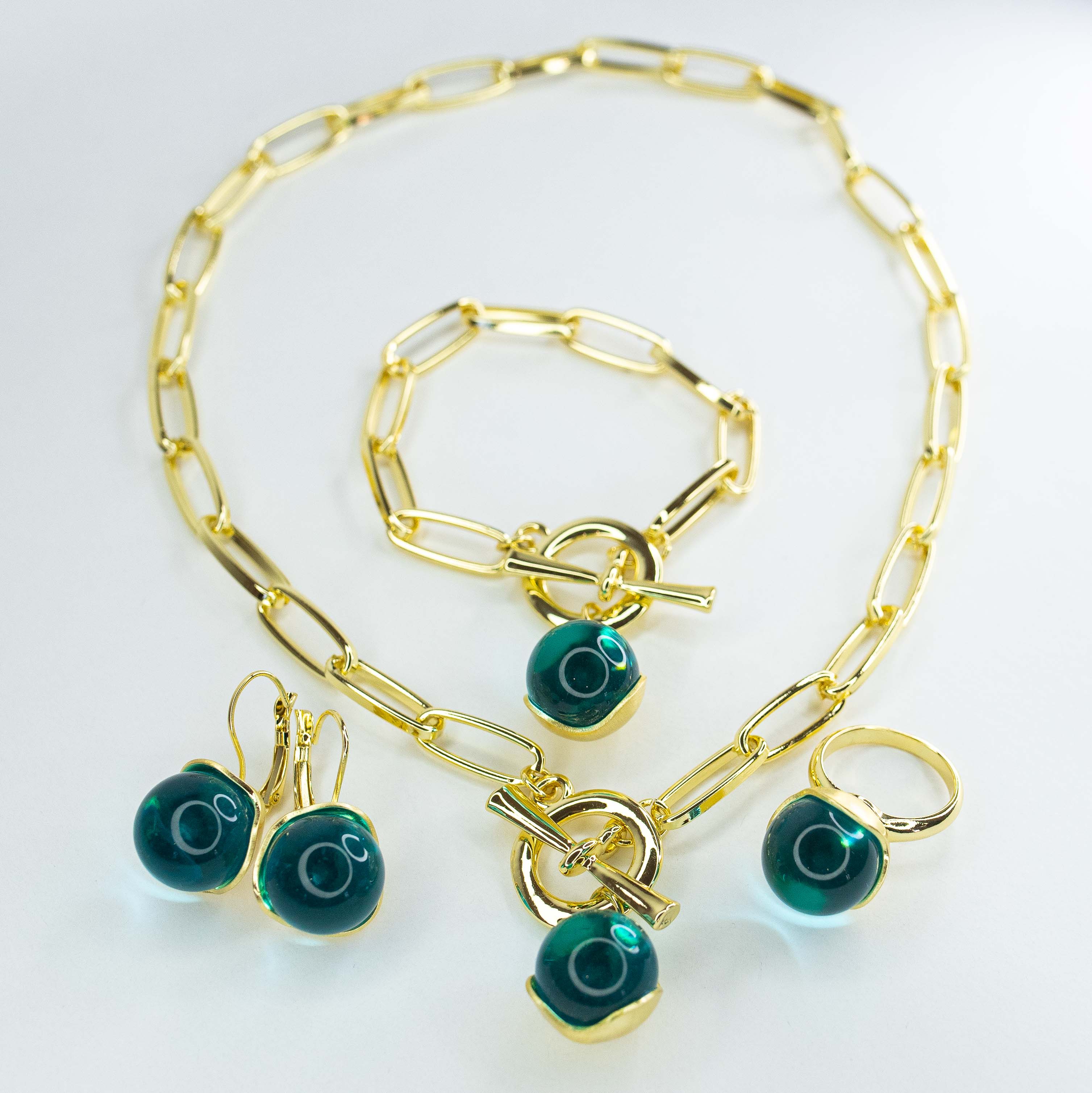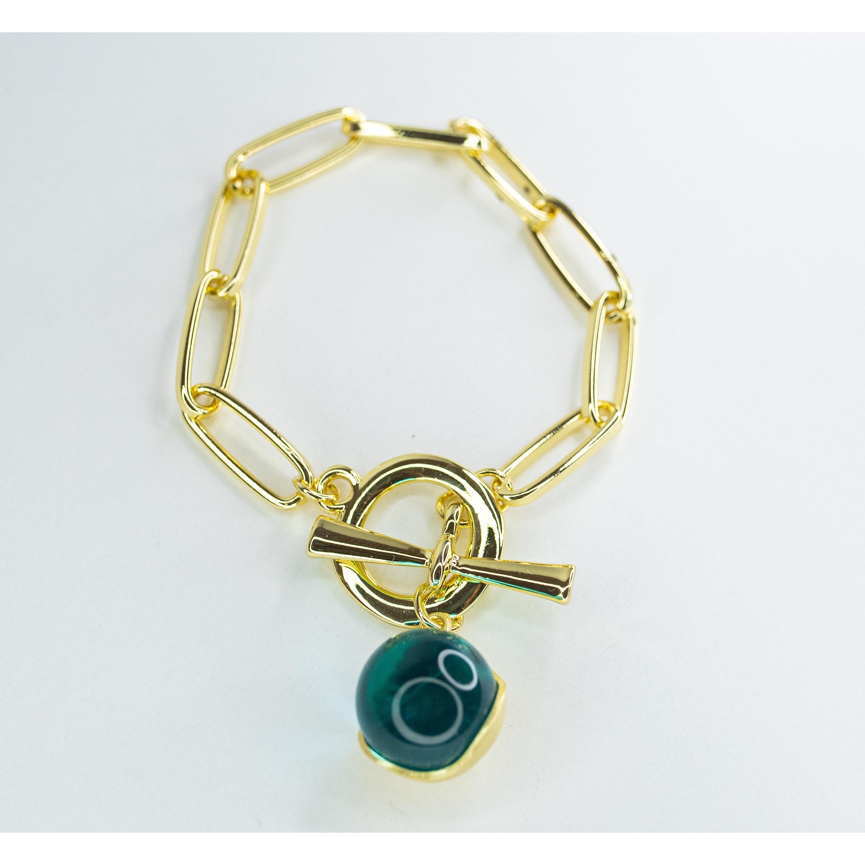 Браслет с подвеской из гипоаллергенного ювелирного сплава желтого цвета. Вставка- ювелирное стекло зеленого цвета, диаметр вставки-2,0см. Браслет цепочный, размер-18,0. Замок- тогл.