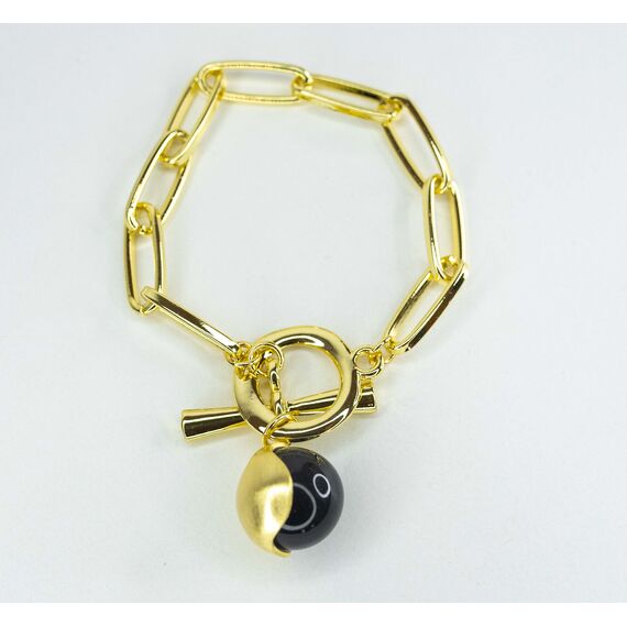 Браслет женский из гипоаллергенного ювелирного сплава желтого цвета. Вставка- ювелирное стекло, цвет- серый. Высота подвески-2,5см, ширина-2,0см. Размер браслета-18,0. Застежка-тогл.