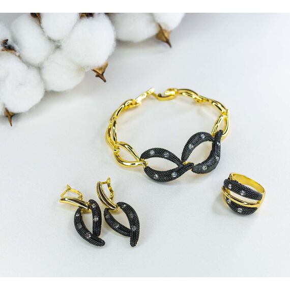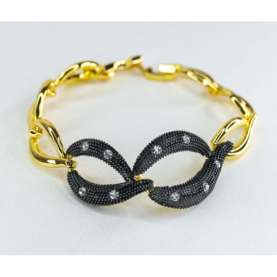 Браслет женский из гипоаллергенного ювелирного сплава черного и желтого цвета. Вставка- цирконы, цвет- белый. Высота браслета-2,0см. Браслет состоит звеньев разных размеров. Замок- карабин. Размер-18,0.