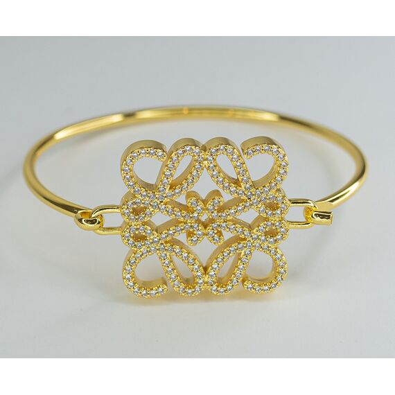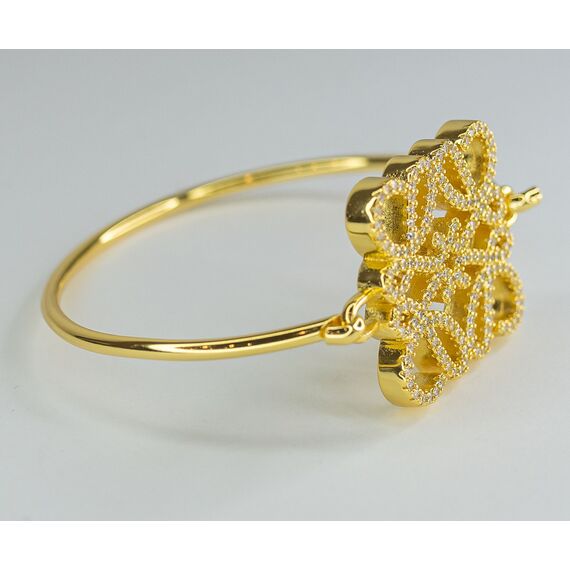 Браслет женский из гипоаллергенного ювелирного сплава желтого цвета. Вставка- цирконы белого цвета. Высота центральной части браслета-3,0см, ширина-3,0см. Браслет жесткий, замок- крючок.