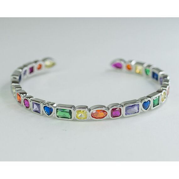 Браслет женский из гипоаллергенного ювелирного сплава серого цвета. Вставка- ювелирное стекло, цвет- микс. Браслет жесткий в виде обруча, незамкнутый, безразмерный. Толщина браслета-1,0см.