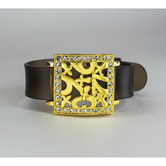 Браслет женский из ювелирного сплава желтого цвета на силиконовом ремешке коричневого цвета. Вставка- цирконы белого цвета. Высота и ширина украшения-3,5см, высота ремешка-3,0см. Размер браслета-18,0. Замок- пряжка.