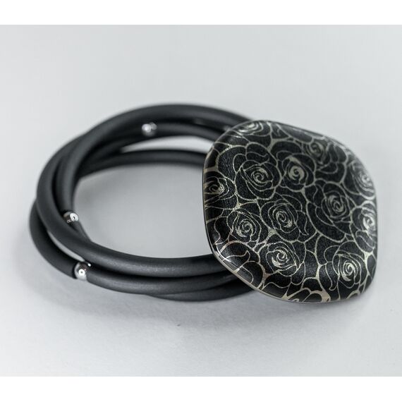 Браслет женский из каучука, цвет-черный и гипоаллергенного ювелирного сплава серого цвета. Вставка- муранское стекло, цвет- черный с принтом золотого цвета. Высота украшения из муранского стекла-5,0см. Браслет незамкнутый, без замка, безразмерный.