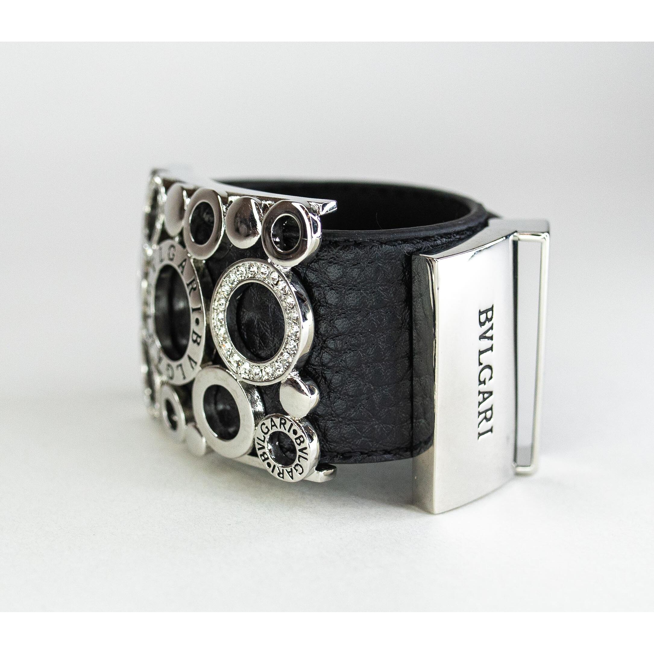 Браслет женский из гипоаллергенного ювелирного сплава серого цвета и натуральной кожи черного цвета. Вставка- циркон белого цвета. Высота браслета-4,0см, ширина-5,0см. Застежка-пряжка.