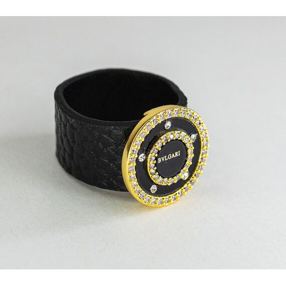 Браслет женский из гипоаллергенного ювелирного сплава желтого цвета и натуральной кожи черного цвета. Вставка- циркон белого цвета. Покрытие эмалью черного цвета. Высота браслета-4,0см, ширина-4,0см. Застежка-пряжка.