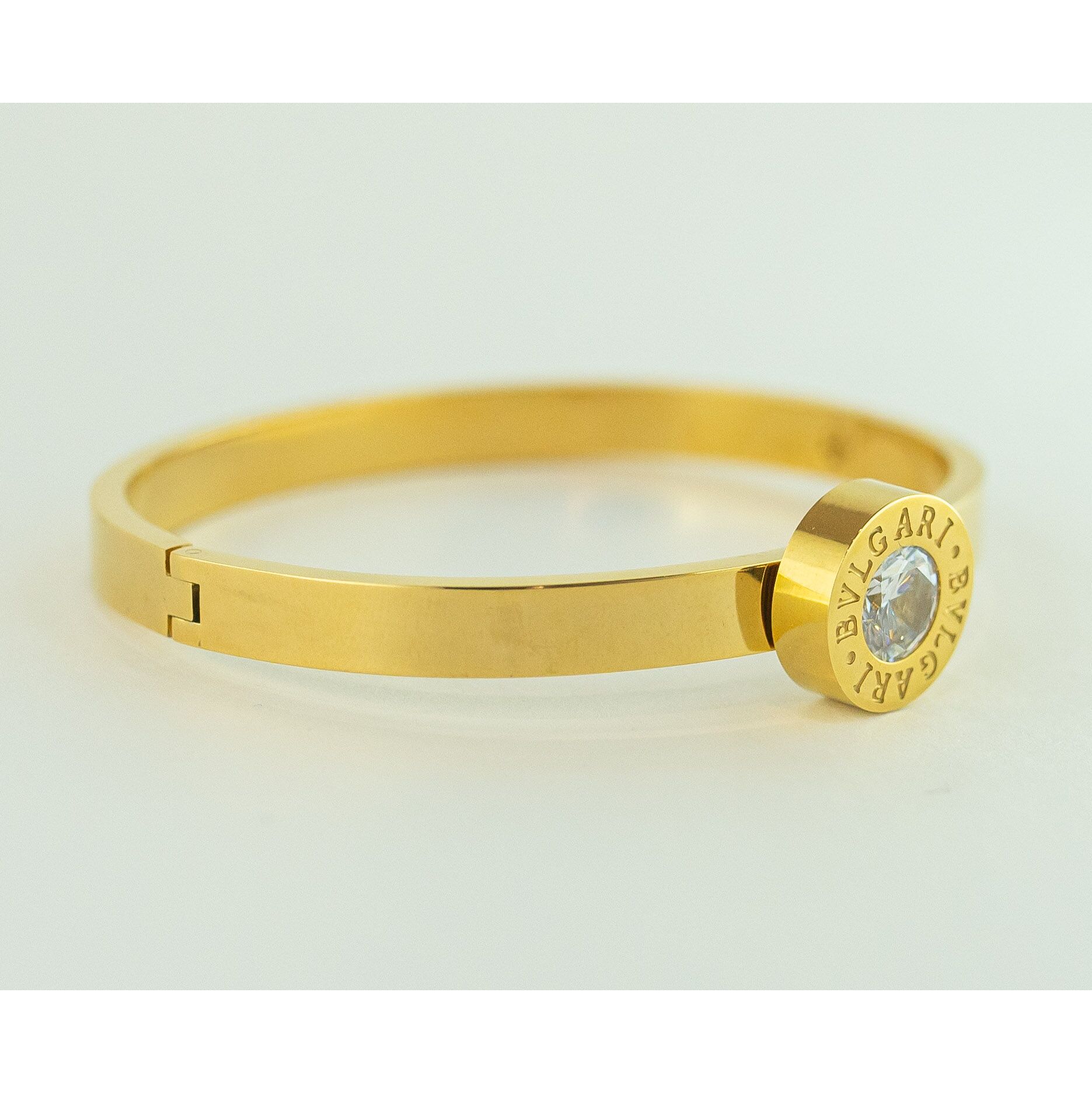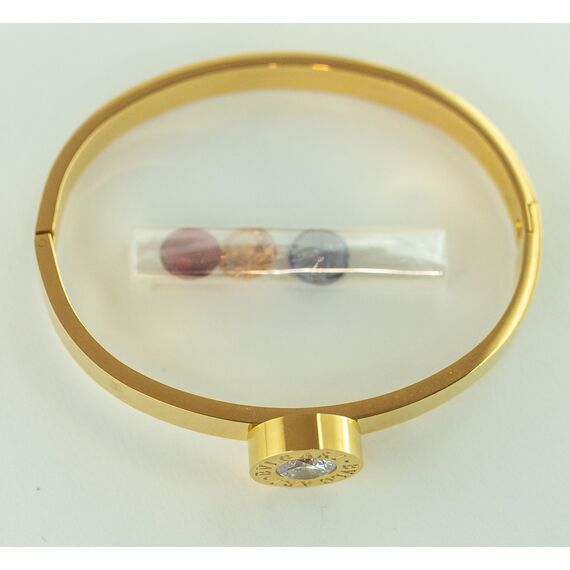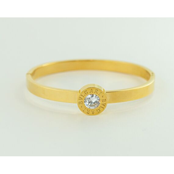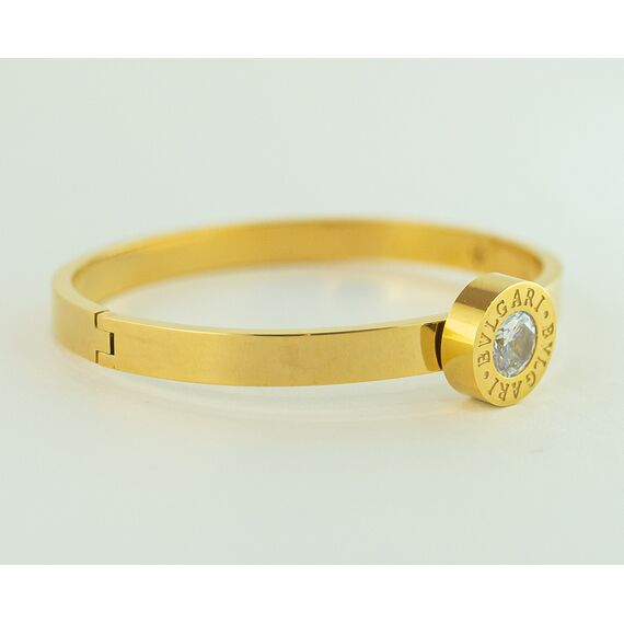 Браслет жесткий женский из гипоаллергенного ювелирного сплава желтого цвета. Вставка- циркон белого цвета. Браслет разъёмный, застежка- пряжка. Размер-18,0. Высота браслета-1,0см.