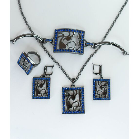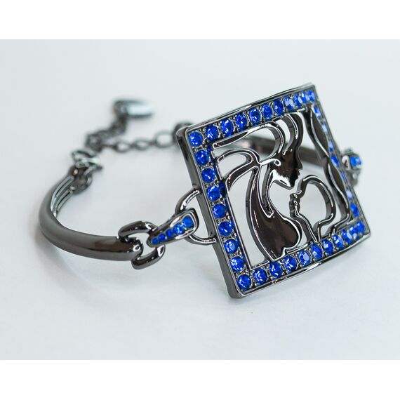 Браслет женский из гипоаллергенного ювелирного сплава черного цвета. Вставка- кварц синего цвета. Высота центра браслета-2,5см, ширина-4,0см. Браслет жесткий с застежкой- карабин. Размер-18,0 (размер регулируется цепочкой на удлинение).