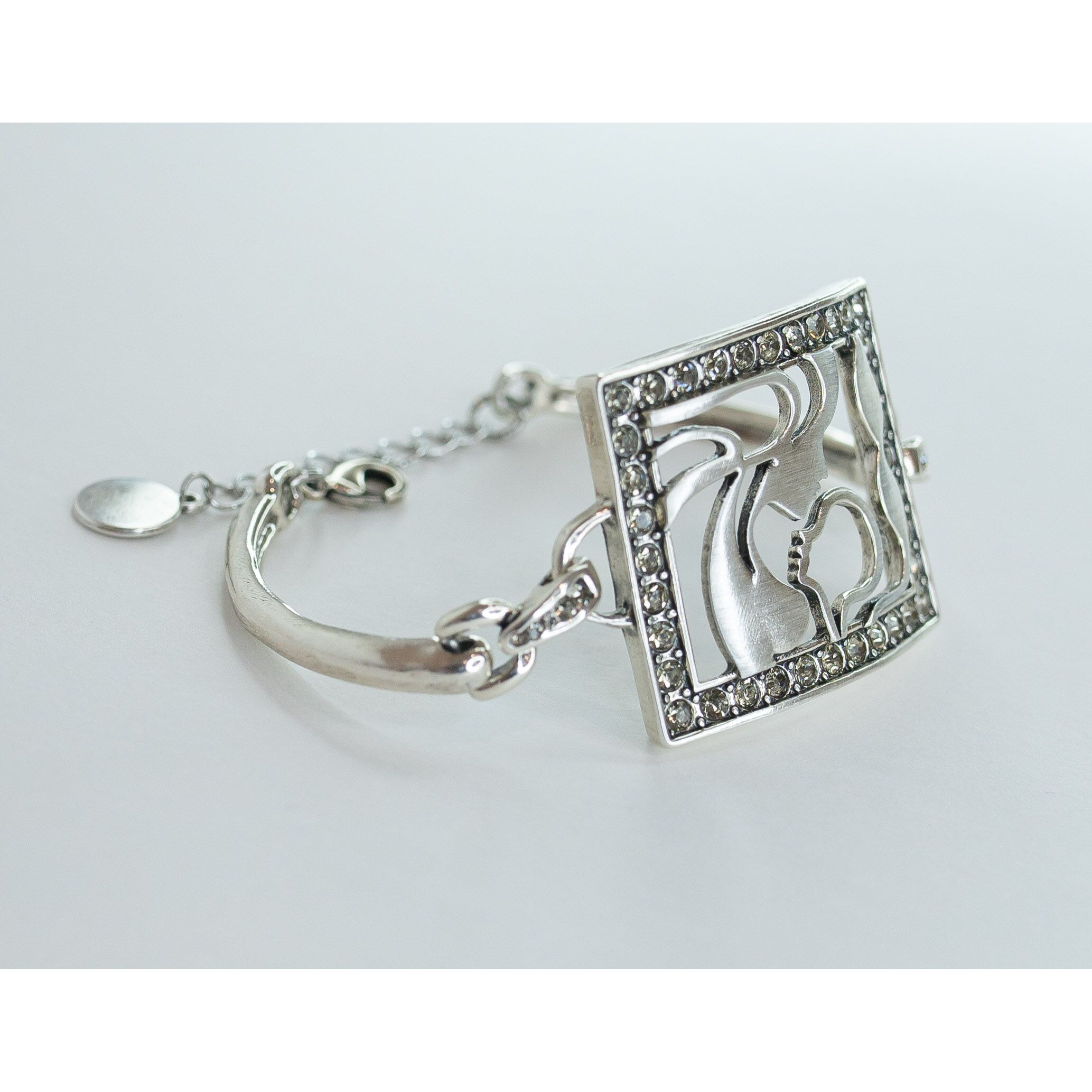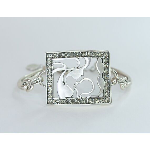 Браслет женский из гипоаллергенного ювелирного сплава серого цвета. Вставка- циркон белого цвета. Высота центра браслета-2,5см, ширина-4,0см. Браслет жесткий с застежкой- карабин. Размер-18,0 (размер регулируется цепочкой на удлинение).