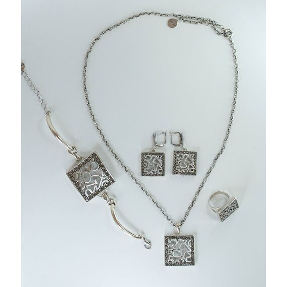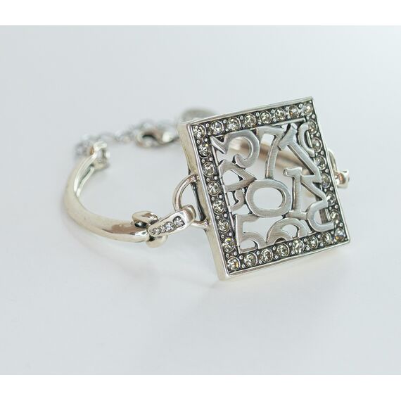 Браслет женский из гипоаллергенного ювелирного сплава серого цвета. Вставка- циркон белого цвета. Высота центра браслета-3,0см, ширина-3,0см. Браслет жесткий с застежкой- карабин. Размер-18,0 (размер регулируется цепочкой на удлинение).