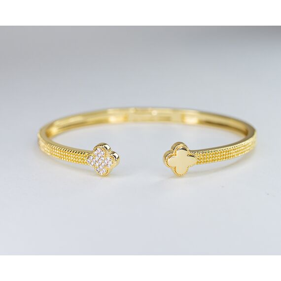 Браслет женский из высококачественного гипоаллергенного ювелирного сплава желтого цвета. Вставка- цирконы белого цвета. Высота браслета-1,0см. Браслет жесткий, незамкнутый, без замка, размер-17,0-18,0.