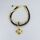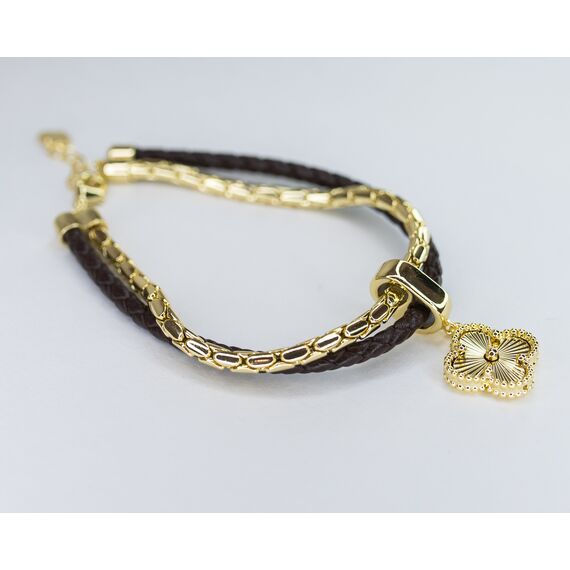 Браслет женский из высококачественного гипоаллергенного ювелирного сплава желтого цвета с подвеской и кожаного ремешка черного цвета. Без вставок. Высота браслета-1,0см. Размер-18,0, регулируется удлиняющей цепочкой. Замок - карабин.