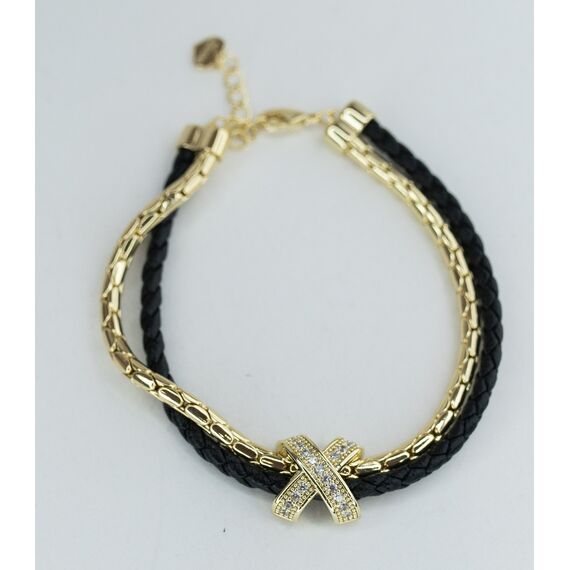 Браслет двойной женский из высококачественного ювелирного сплава желтого цвета и кожаного скрученного ремешка черного цвета. В центре соединения двух браслетов- вставка с цирконами белого цвета. Размер-17,0-18,0. Замок- карабин.